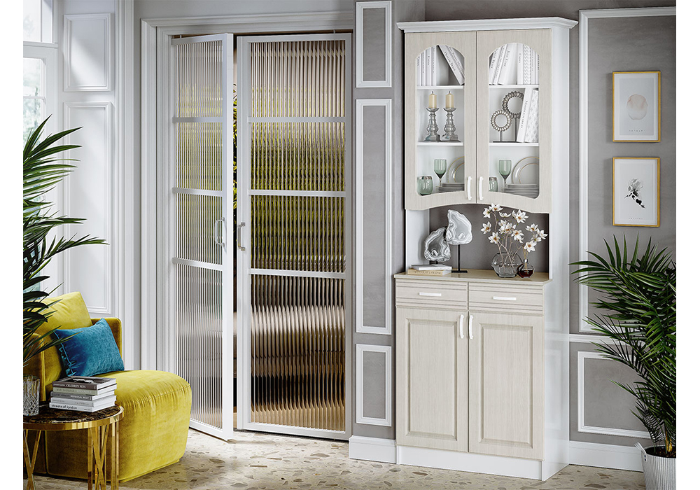 Верхние витринные полки рассчитаны на вес до 3 кг. Высота открытой ниши 35 см.