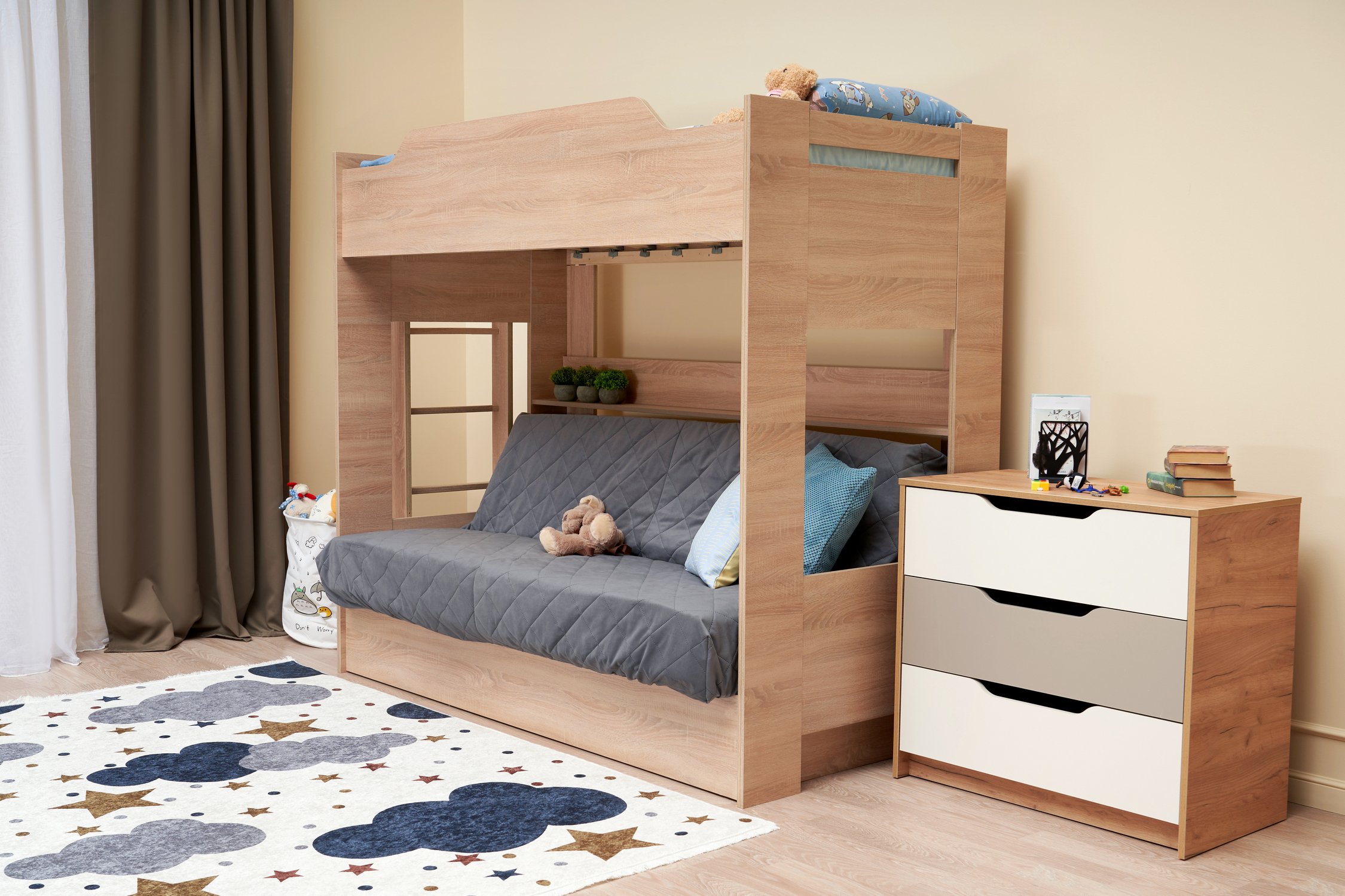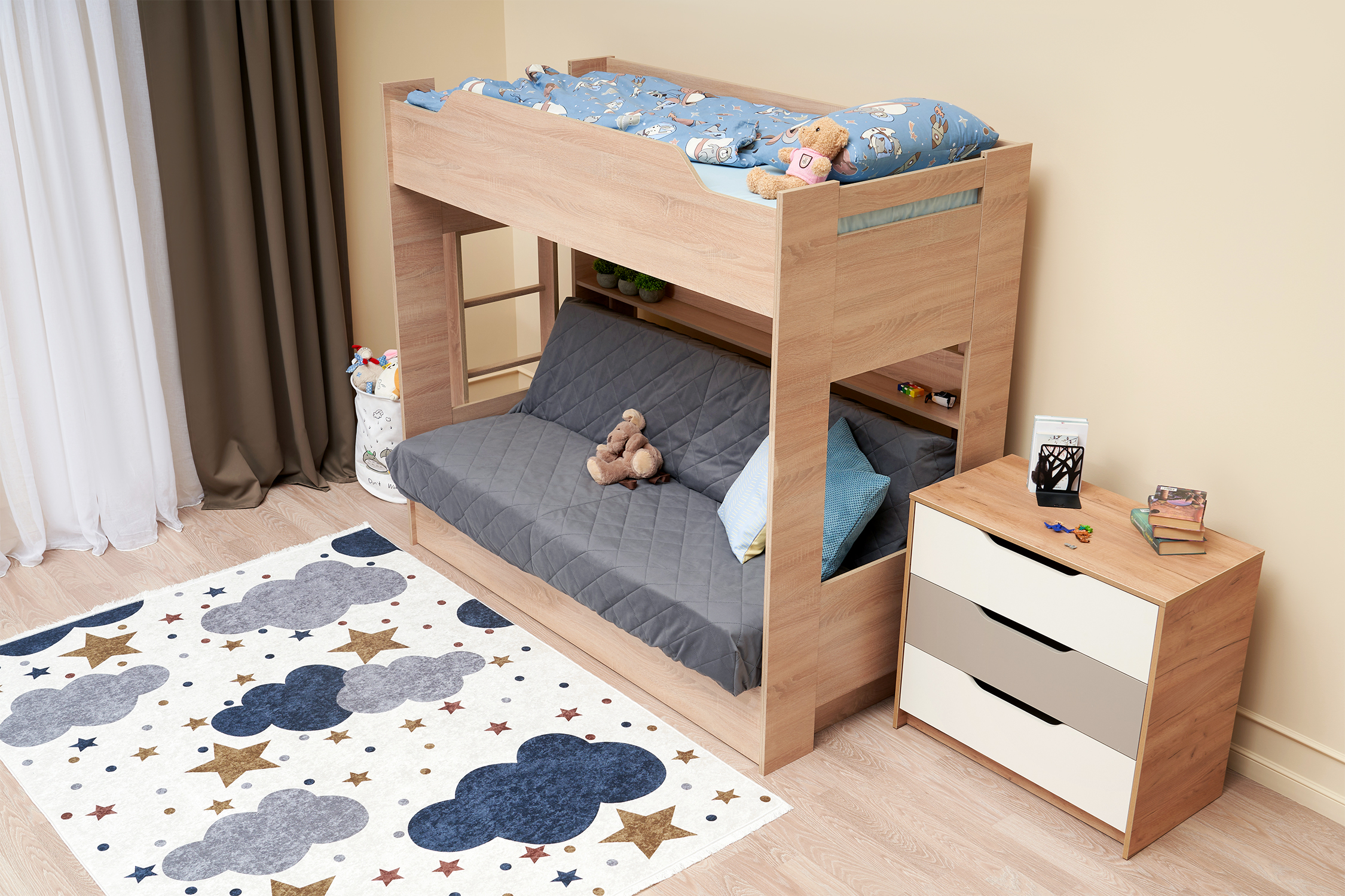 Механизм трансформации дивана: «Книжка». Рекомендуемая высота матраса на верхний ярус 17 см. Максимальная нагрузка на верхний ярус 50 кг. Лестница может быть установлена с обеих сторон кровати. Высота бортика 30 см. Максимальная нагрузка на нижний ярус 90 кг. Чехол съемный.