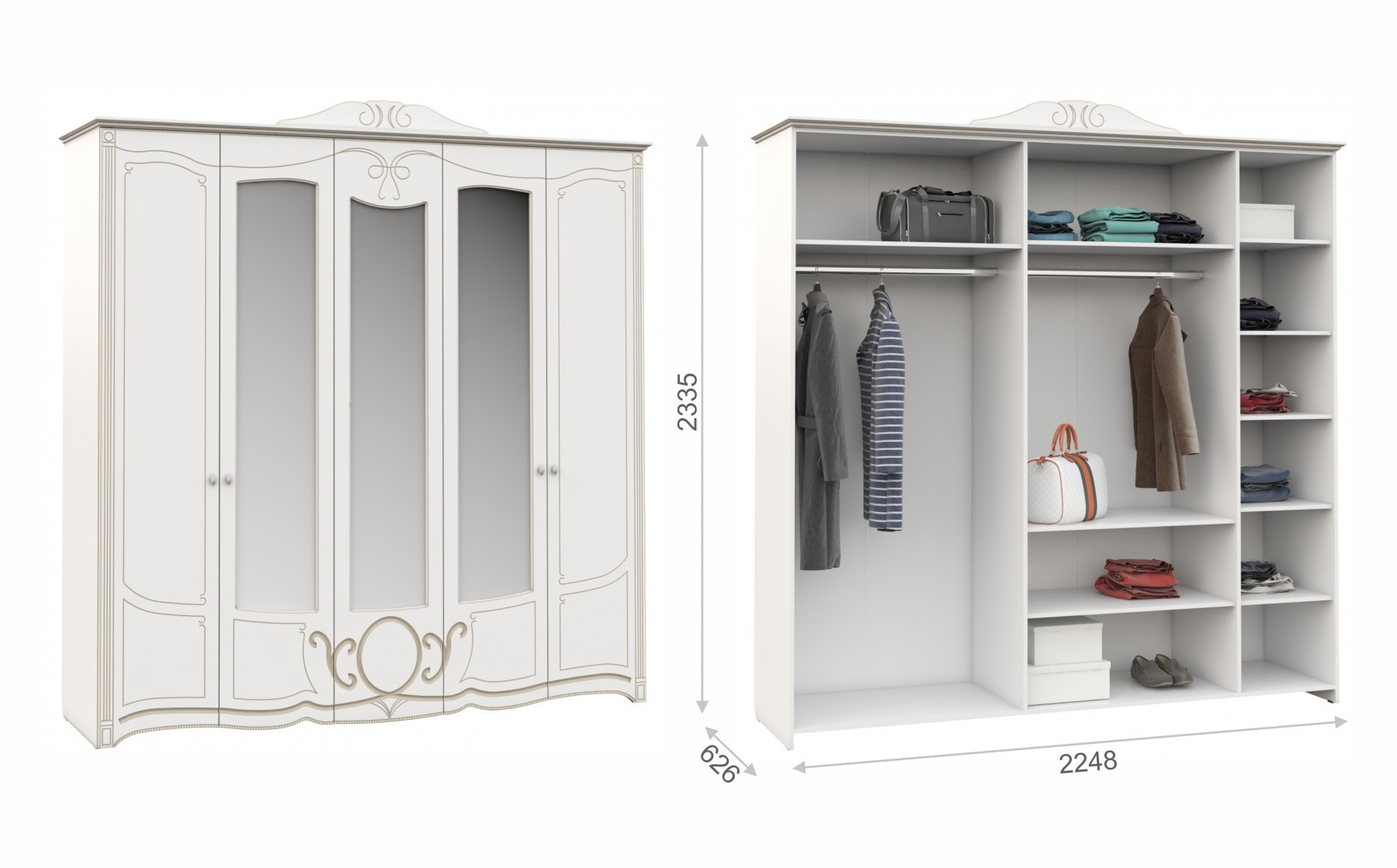 • Шкаф 5-ти Створчатый: Ширина 2248 мм х Глубина 626 мм x Высота 2335 мм